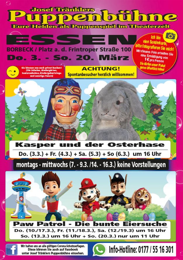 Ostern ist das Fest der Freude. Daher hat Kasper seine neuen Freunde mitgebracht. So können auch in diesem Jahr die großen und kleinen Besucher:innen mit Josef Tränklers Puppenbühne wieder spannende Abenteuer erleben. Die extra angefertigte Paw P...